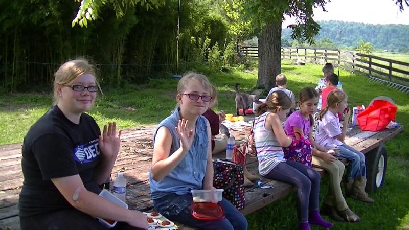 Each child must wear long pants for the riding lesson portion of camp but it is recomended to bring shorts to change into for the afternoon fun which often involves getting wet. Shoes for wading in the creek are recomended as well. We usually cook out at least once during each camp but children will need to bring a sack lunch each day unless notified by us. We picnic almost each day. We have a refrigerator in the main barn to keep food and drinks cold.
